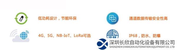 低功耗设计,节能环保,通道数据传输安全性高,4G、5G、NB-IoT、LoRa可选,IP68,防水,防爆。