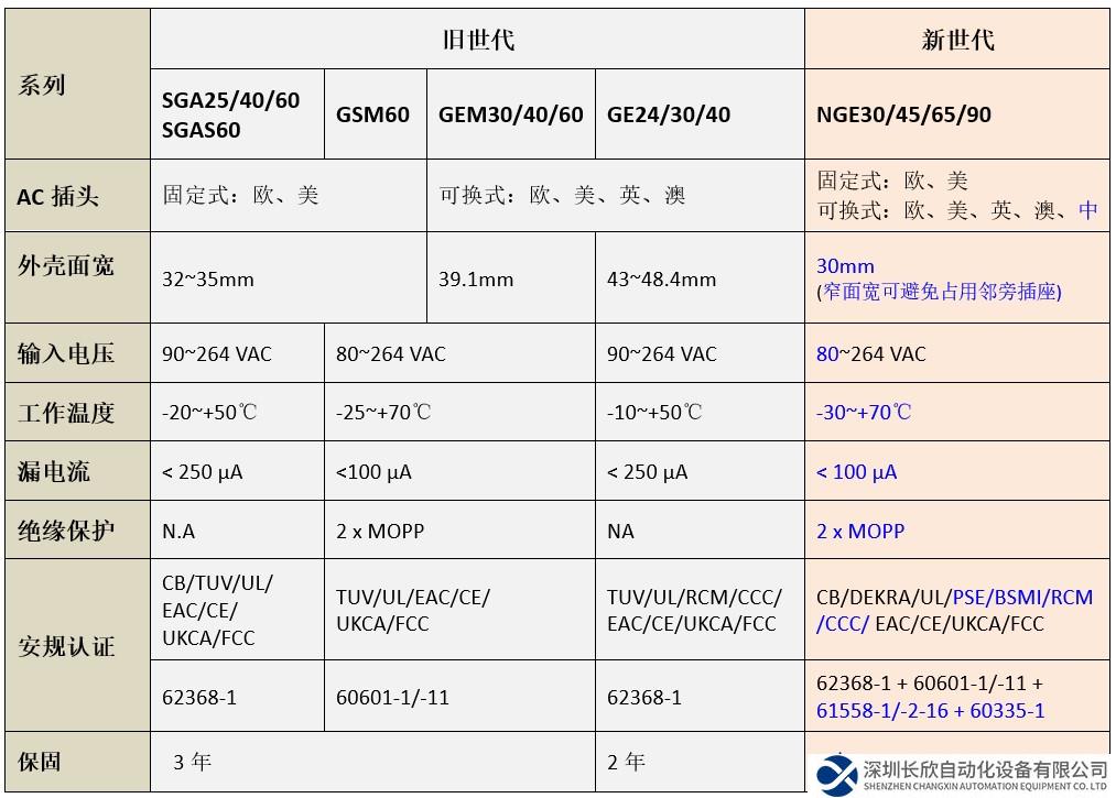 百瑞彩票 NGE 30 / 45 / 65 / 90相较于上市多年的 24~60W SGA / SGAS / GSM / GE / GEM 等系列,最大差异是一机同时拥有 62368-1 / 60601-1 / 61558-1 / 60335-1 等各应用领域安规,并增加了 CCC / BSMI / PSE 认证、窄面宽 (30mm) 可避免占用邻旁插座、宽温 -30~+70℃ 使用国家或安装空间较不受限、设计符合 2xMOPP 适用医疗 BF 类…等 (详细差异如下表)。本家族是一系列高质量、寿命长、轻薄便携、认证齐全的插墙式节能适配器,非常适用于各种消费性电子装置、商旅用电子装置、或电子装置跨国销售全球,需搭配可换式 AC 插头适配器…等应用。