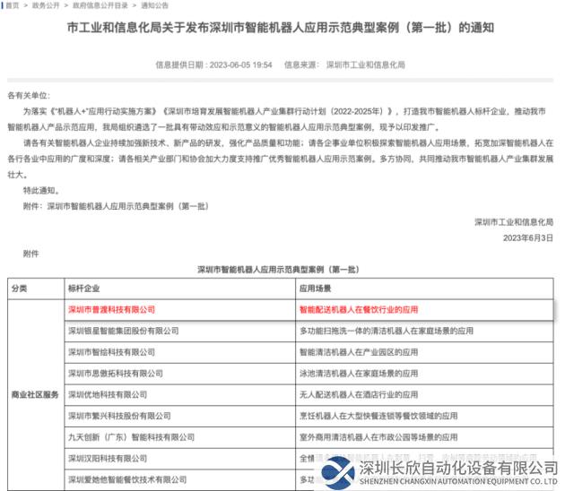 为落实《“机器人+”应用行动实施方案》《深圳市培育发展智能机器人产业集群行动计划(2022-2025年)》,打造深圳市智能机器人标杆企业,推动深圳市智能机器人产品示范应用,深圳市工业和信息化局组织遴选了一批具有带动效应和示范意义的智能机器人应用示范典型案例,共同推动智能机器人产业集群的发展壮大。其中,深圳市普渡科技有限公司作为全球商用服务机器人标杆企业,成为第一批深圳市智能机器人应用示范典型案例。