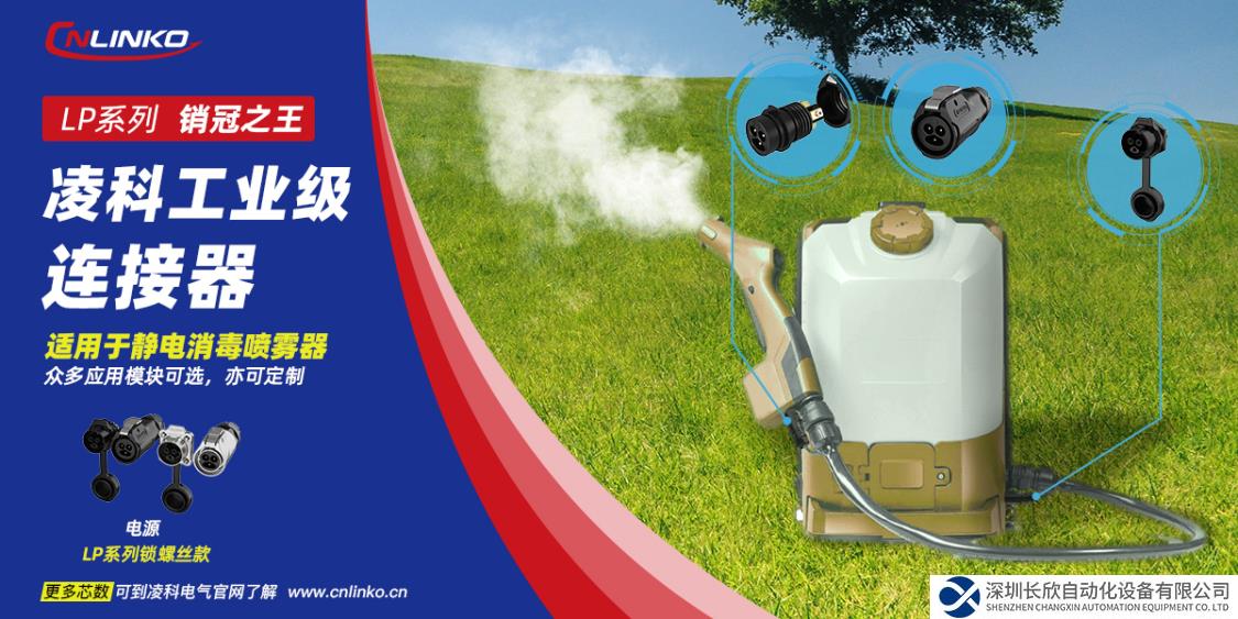 对于静电消毒喷雾器产生可靠稳定的静电是关键。凌科电气LP系列工业级连接器为喷雾器的静电模块提供供电电气连接,从而使雾化喷嘴产生的雾化药物带上静电。目前采用的LP系列电源连接器为三芯连接器,接线方式为锁螺丝接线。