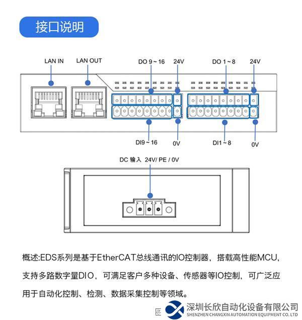 概述:EDS系列是基于EtherCAT总线通讯的IO控制器,搭载高性能MCU,支持多路数字量DIO,可满足客户多种设备、传感器等IO控制,可广泛应用于自动化控制、检测、数据采集控制等领域。