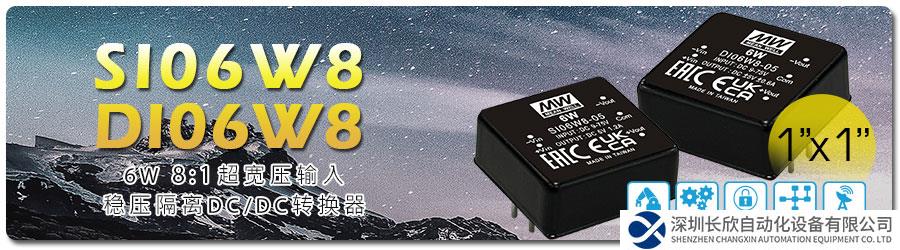明纬继推出 1" x 1" 6W/15W/20W/30W 4:1 宽压输入 DC/DC 转换器后广受好评,为满足 1" x 1" 输入范围更宽压的需求,新推出了 8:1 输入 6W 的单组输出 SI06W8 及双组输出 DI06W8 系列。
